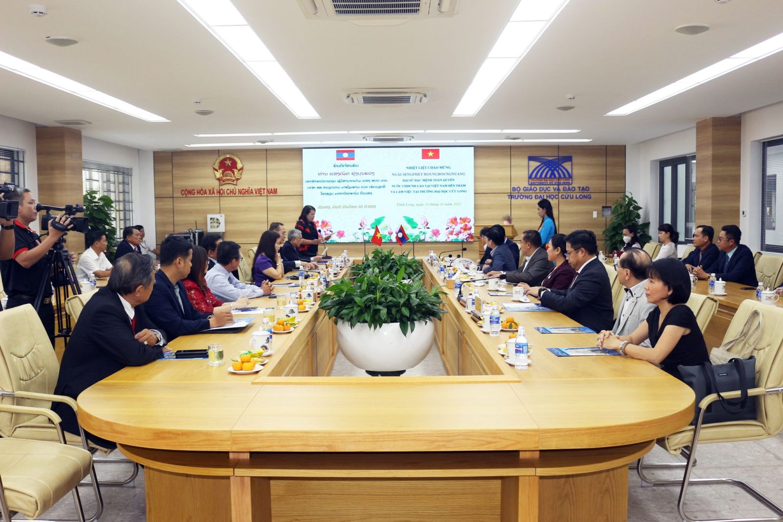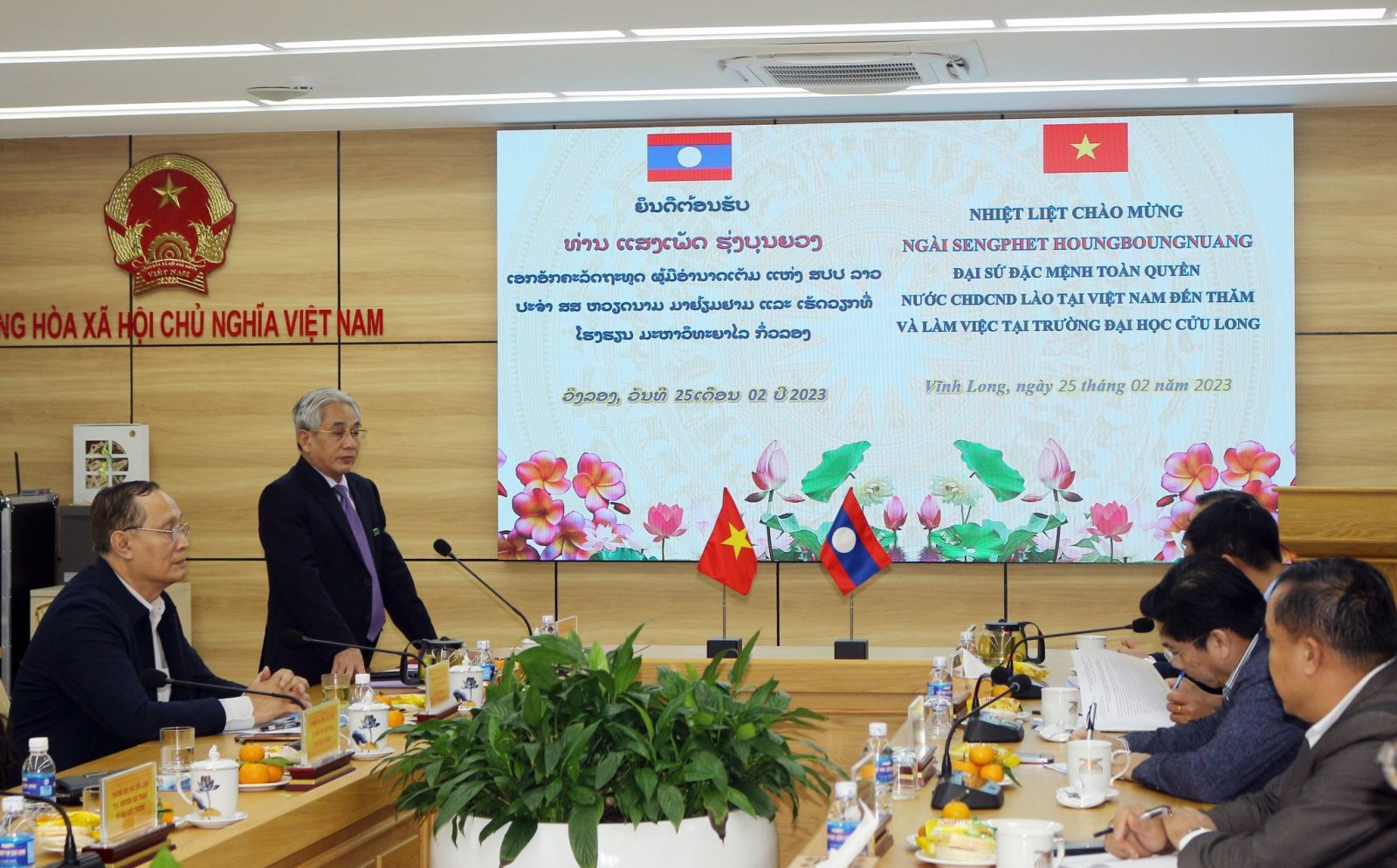 Chiều ngày 25/02/2023, Đoàn công tác của Đại sứ nước Cộng hòa dân chủ nhân dân (CHDCND) Lào tại Việt Nam do ngài SENGPHET HOUNGBOUNGNUANG – Đại sứ đặc mệnh toàn quyền nước CHDCND Lào làm Trưởng đoàn đến thăm và làm việc tại Trường ĐH Cửu Long.